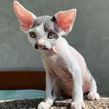 Rex is an 8-week-old Devon Rex kitten with the iconic big ears, elfin face, and a mostly bare body that’s soft to the touch and warm in your arms. He may not have much fur, but he’s full of charm, curiosity, and confidence.