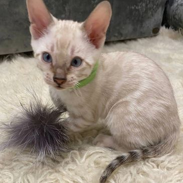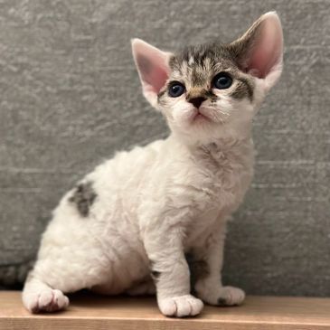 Molly is an 8-week-old female Devon Rex with those signature big ears, delicate frame, and that irresistibly soft, almost bare coat. She’s a lively little bundle of joy, curious about everything and eager to explore her world.